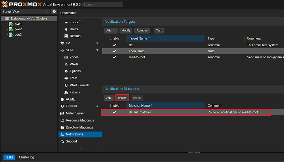 Notification qua email trong Proxmox giúp quản trị viên nhận thông báo kịp thời về tình trạng hệ thống. Các notification hỗ trợ trên Proxmox bao gồm: update bản cập nhật (package-updates), node cluster bị fenced (fencing), lỗi replication (replication), backup thành công/thất bại (vzdump), và mail hệ thống gửi cho root (system-mail). Nhờ đó admin dễ dàng giám sát, xử lý sự cố và đảm bảo hệ thống vận hành ổn định.