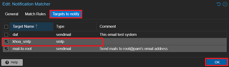 Chọn Targets to notify, chọn smtp đã tạo từ bước trên, nhấn OK.