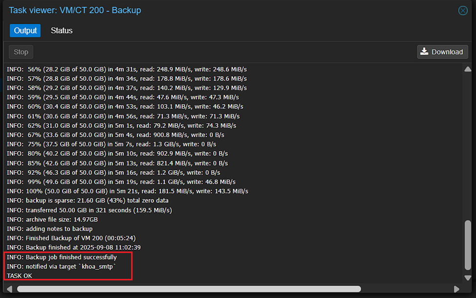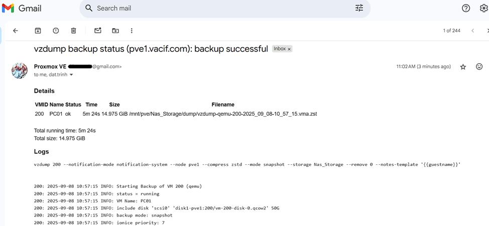 Sau khi hoàn thành tiến trình backup. Proxmox sẽ thông báo notification về email.