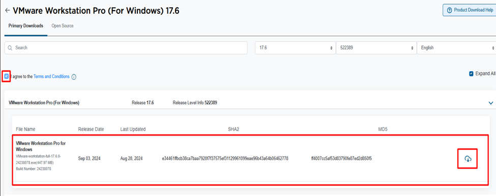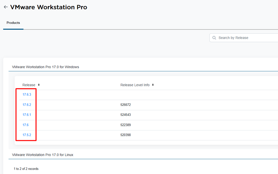 Bạn sẽ thấy tùy chọn các phiên bản cho VMware Workstation Pro 17.0 for Windows.