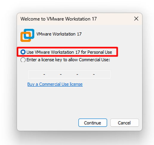 Khi xuất hiện cửa sổ yêu cầu bản quyền, chọn Use VMware Workstation 17 for Personal Use rồi nhấp Continue.