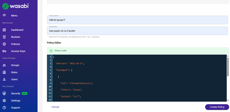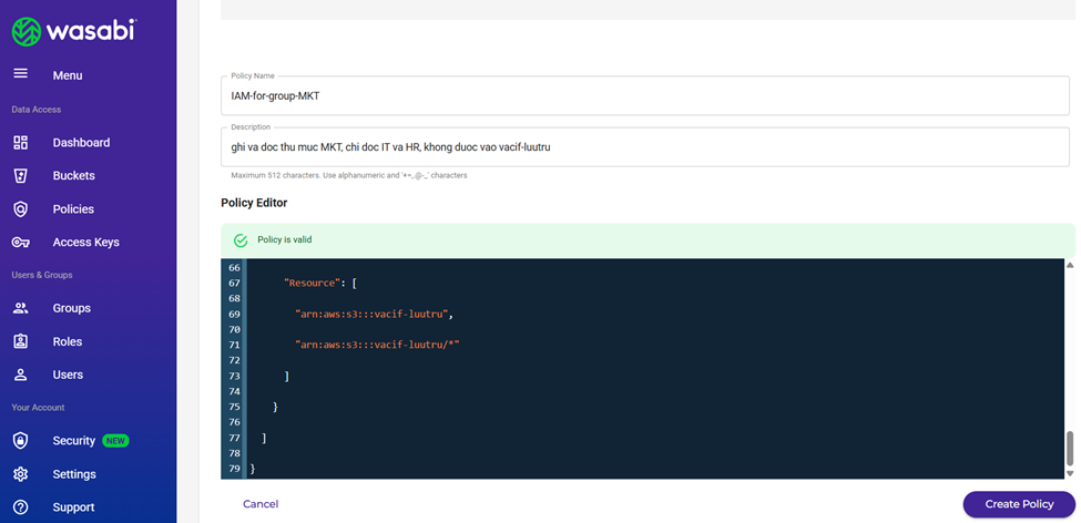 Việc triển khai IAM Policy JSON trong Wasabi giúp: