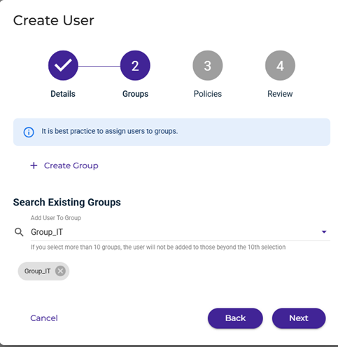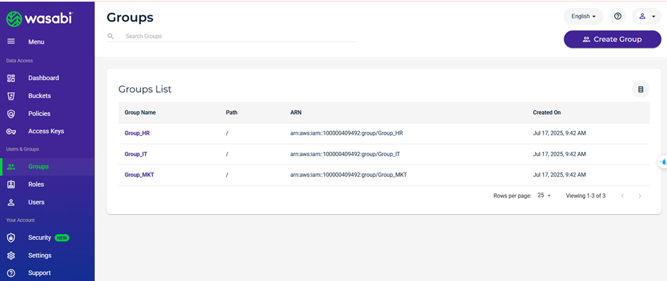 Mỗi nhóm sẽ được gán policy riêng biệt (tham khảo phần hướng dẫn JSON policy trước đó).
