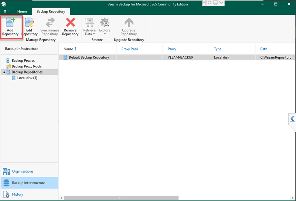 Đầu tiên ở trong giao diện Veeam Backup for Microsoft 365, ta chọn mục Backup Infrastructure -> Add Repository để tiến hành thêm 1 kho lưu trữ khác.