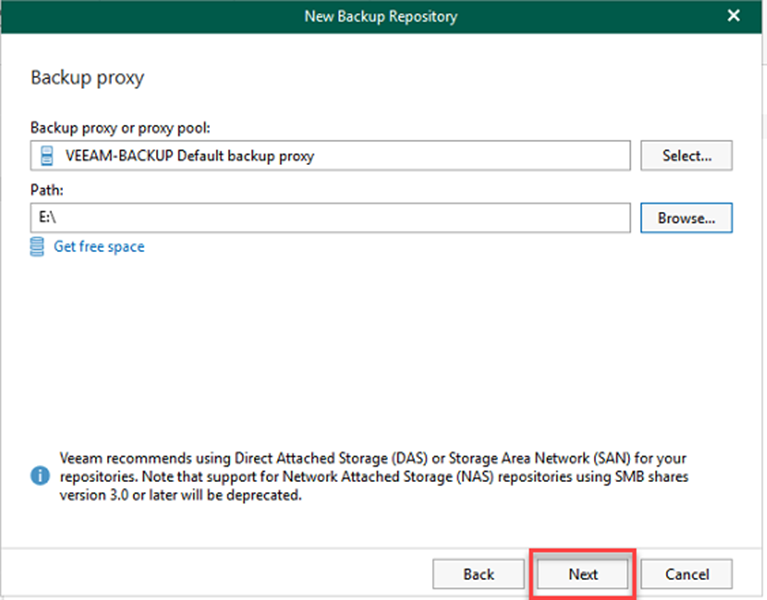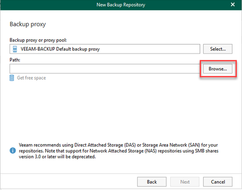 Tiếp đến ta sẽ chọn đường dẫn cho kho lưu trữ bằng cách ấn Browse…, đây sẽ là nơi các file backup được lưu trữ vào đây