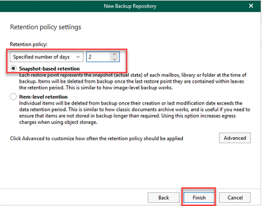 Ở bước này sẽ chỉ định chính sách lưu trữ, thời gian mà nó sẽ xóa các file backup được lưu trữ. Ở đây mình chọn Snapshot-based retention và chọn số ngày chỉ định là 2. Sau đó ấn Finish.
