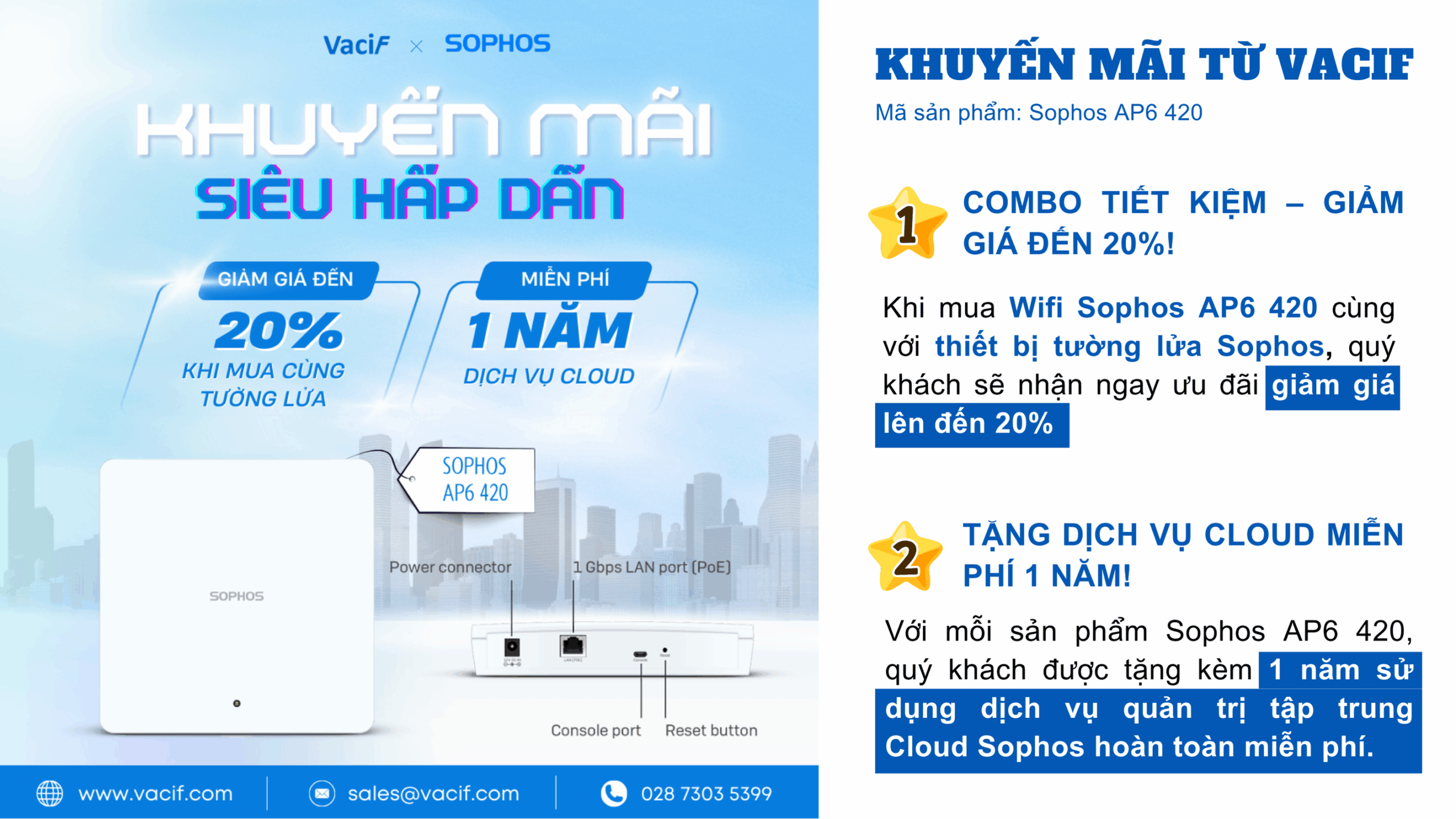 VACIF hân hạnh là đối tác chính thức của Sophos tại Việt Nam, cam kết mang đến cho quý khách sản phẩm chính hãng, dịch vụ tư vấn chuyên nghiệp và hỗ trợ kỹ thuật tận tâm. Đừng bỏ lỡ cơ hội này để sở hữu giải pháp Wifi doanh nghiệp bảo mật hàng đầu với mức giá ưu đãi nhất.