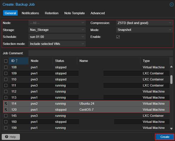 Sau đó chọn các máy ảo cần được backup (ví dụ: máy ảo VMID 114, VMID 120)