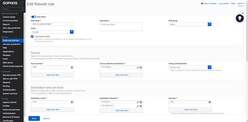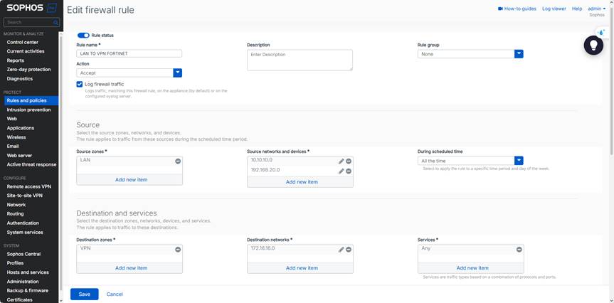 Mạng LAN 172.16.16.0/24 (Fortinet) ⬄ Mạng LAN 10.10.10.0/24 và 192.168.20.0/24 (Sophos) có thể kết nối qua lại trực tiếp.