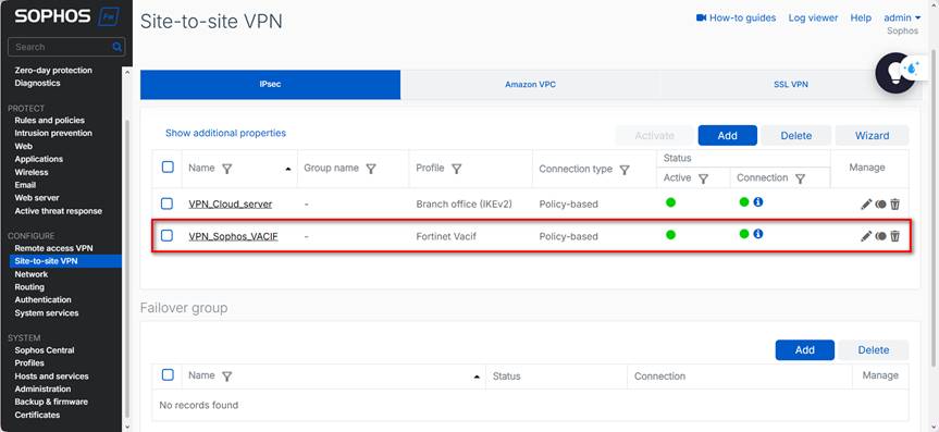 Sophos: VPN → IPsec Connections → Status: 🟢 Connected