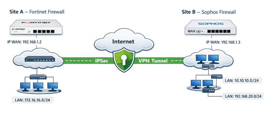 Bài viết này hướng dẫn cách cấu hình IPSec VPN Site-to-Site giữa hai thiết bị tường lửa Fortinet Firewall và Sophos Firewall, nhằm kết nối an toàn các mạng LAN tại hai site khác nhau thông qua Internet.