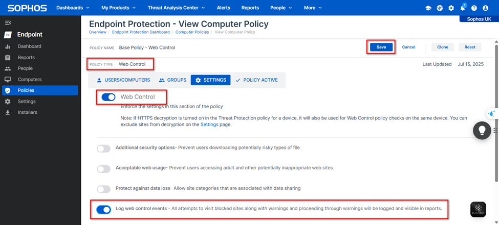 – Đảm bảo các endpoint đã bật tính năng Web Control và Web Journaling (có thể kiểm tra trong Sophos Central).