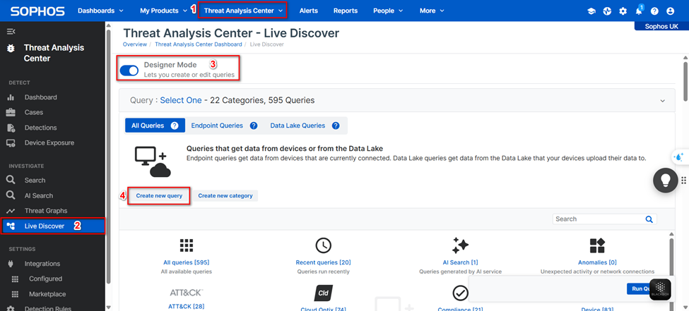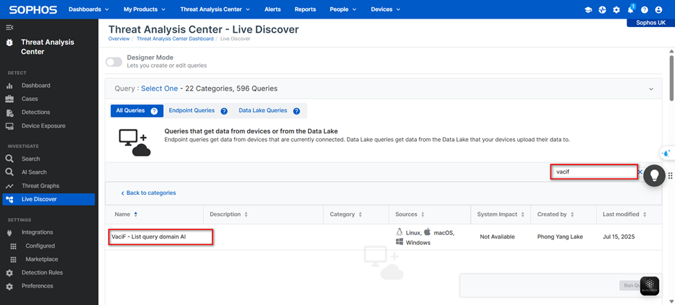 1. Truy cập vào “Threat Analysic Center” → “Live Discover”.