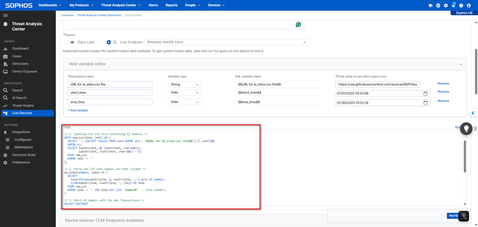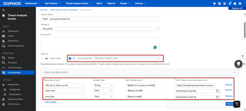 Khi tạo query trong Sophos Central → Live Discover, cần tạo 3 biến như sau:
