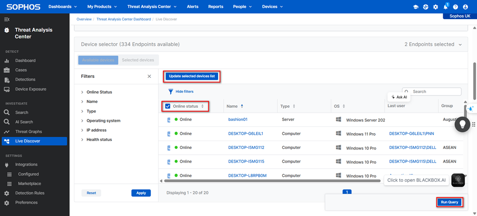 Truy cập vào “Threat Analysic Center” → “Live Discover”.