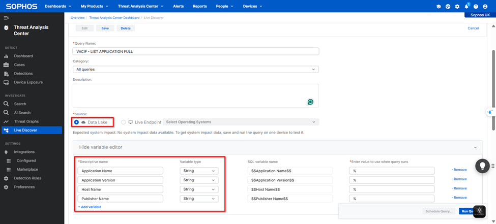 Truy vấn sẽ thực hiện trên nguồn dữ liệu xdr_data, nơi chứa thông tin được đồng bộ từ các thiết bị đã bật tính năng upload Data Lake. Câu lệnh SQL hỗ trợ tìm kiếm ứng dụng theo tên, phiên bản, nhà cung cấp hoặc hostname.