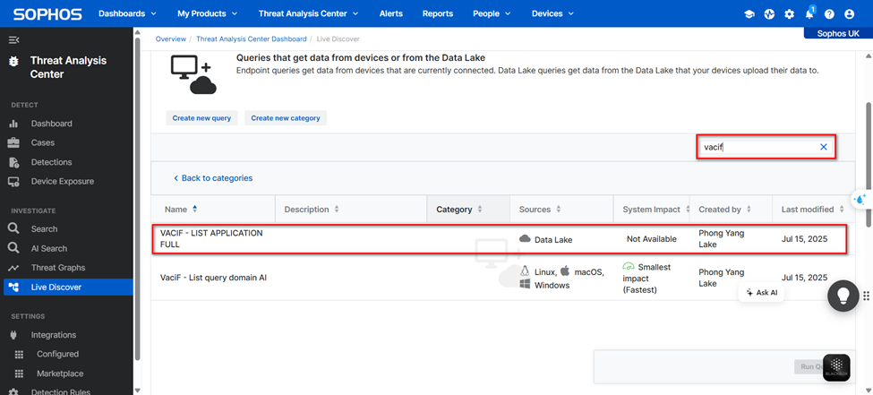 1. Truy cập vào “Threat Analysic Center” → “Live Discover”.